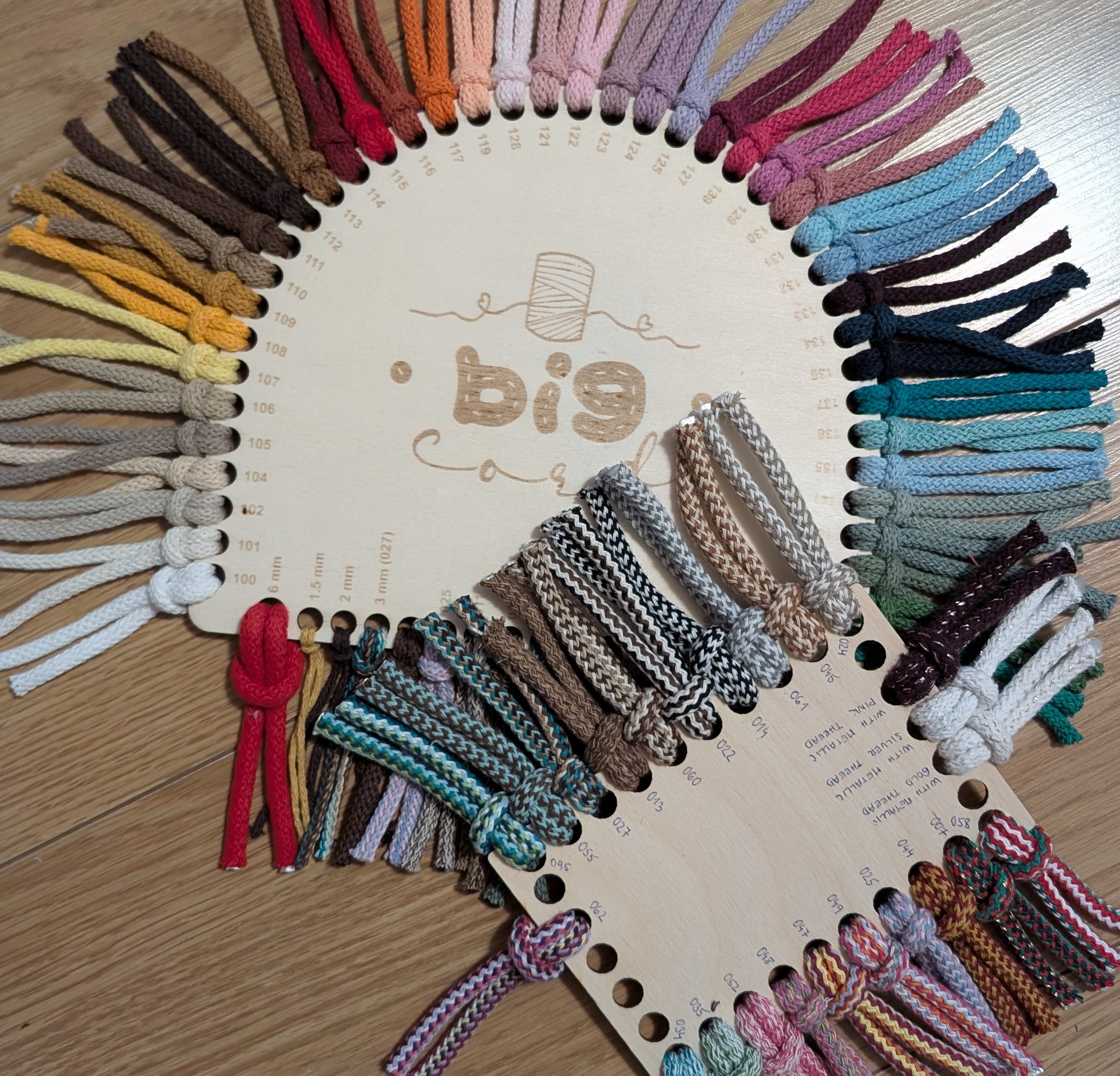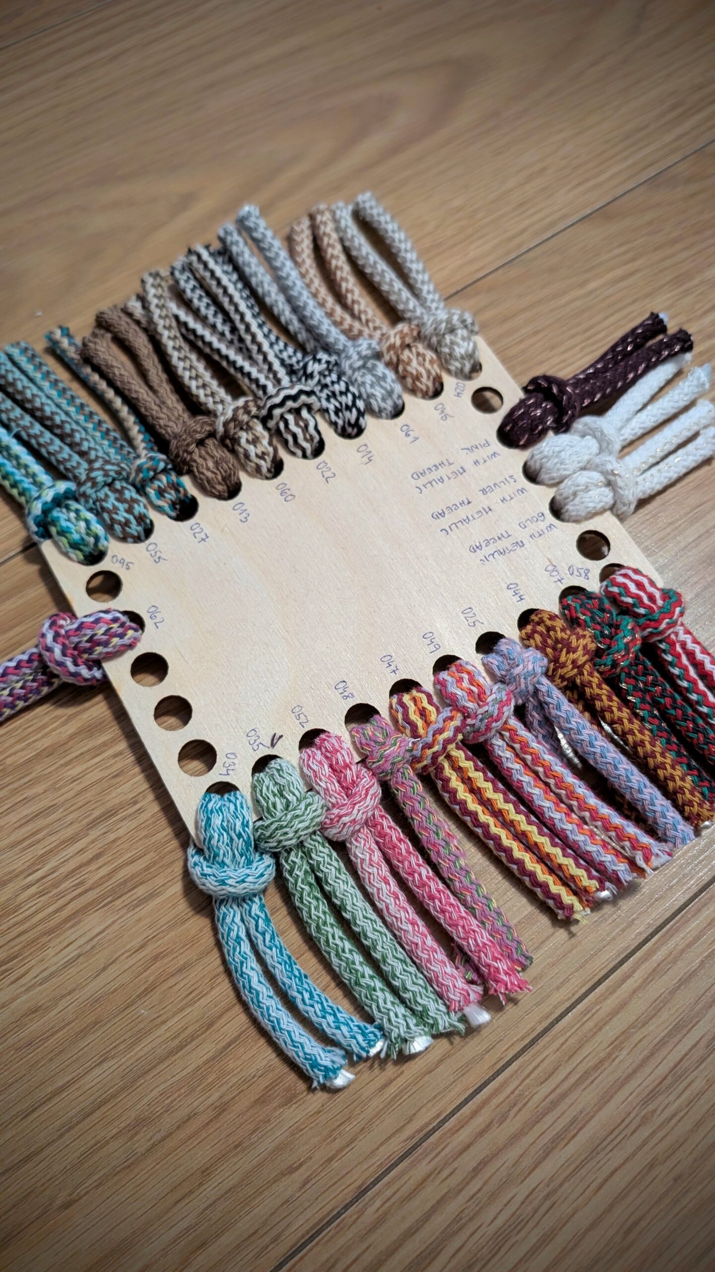 Vzorkovník našich slovenských špagátov VEĽKÁvlna, pripravený prevažne detskými ručičkami, ktoré si na ňom precvičovali jemnú motoriku a zarábali prvé eurá 🙂