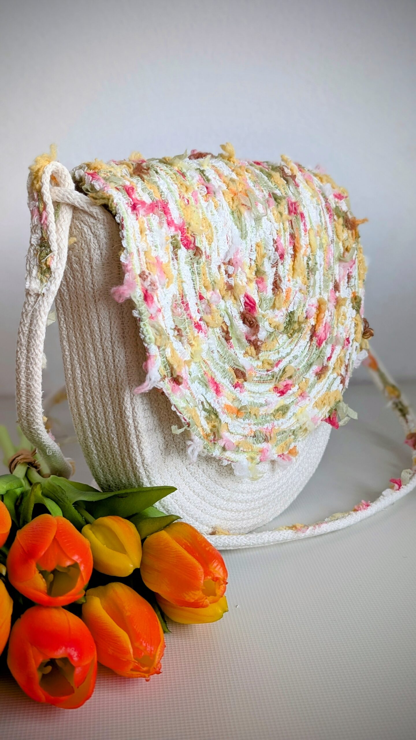 Túto zmiešanú priadzu v teplých letných farbách môžete použiť nielen na vháčkovanie alebo vpletenie k štandartnej priadzi, ale my sme vyskúšali skombinovať túto priadzu so špagátmi na šitie. Výsledok nájdete v galérii.